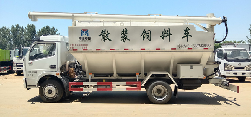 散裝飼料運(yùn)輸車,散裝飼料車的飼料罐架設(shè)在卡車的底盤上,罐頂開(kāi)有進(jìn)料口.頂部的一根螺旋輸送卸料管(俗稱卸料絞龍)則可自由回轉(zhuǎn)和抬升,抬升的仰角可達(dá)60度。運(yùn)輸時(shí),頂部的螺旋管平臥在罐頂;卸料時(shí)則抬起,使管端的出料口與畜禽飼養(yǎng)場(chǎng)貯料罐頂部的進(jìn)料門相接,駕駛室內(nèi)裝有操縱裝置(操縱裝置也可裝置在罐體尾部),卸料時(shí)通過(guò)車底的動(dòng)力輸出軸和減速器來(lái)驅(qū)動(dòng)螺旋,以完成卸料。
