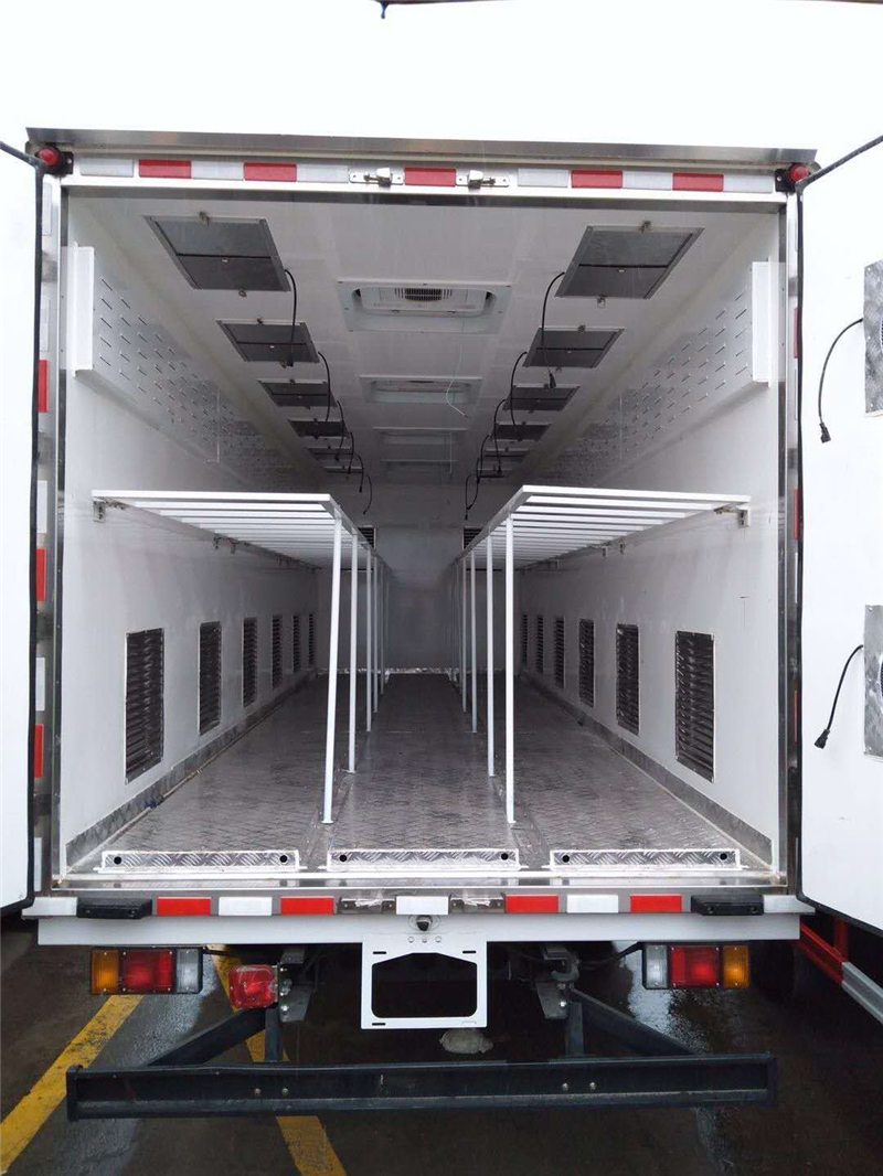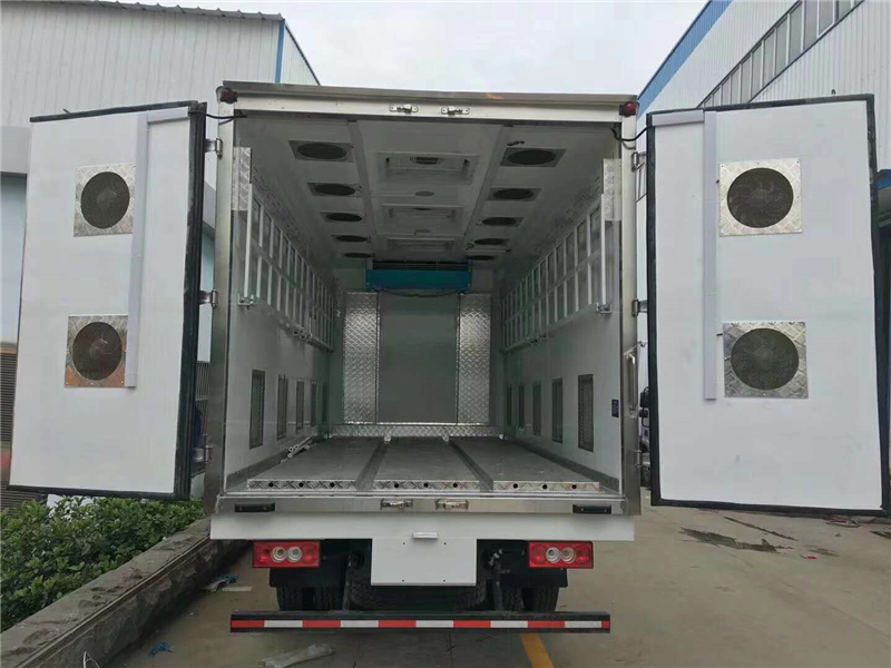 【豬苗車】上裝配置:外玻璃鋼,內(nèi)不銹鋼,兩層液壓升降層板,尾部液壓翻轉(zhuǎn)上豬平臺,層板為不銹鋼骨架鋪鋁花紋板。外部電動升降窗,排氣扇,柴油發(fā)電機(jī),暖風(fēng)加熱,喂水系統(tǒng),凈水箱、污水箱,箱內(nèi)攝像頭監(jiān)控,倒車影像,凱利制冷機(jī)組。(油暖加熱為選裝部件)整車長度12000*2550*3970,箱體長度9600*2340*2540(8660 裝載長),發(fā)動機(jī):康明斯機(jī)320.